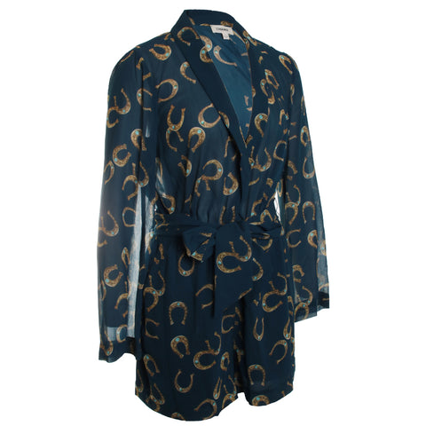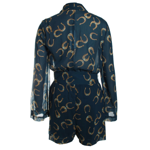 Featuring a billowy long sleeve and a horseshoe print, the button front Arabell Romper by L'Agence is effortless and sophisticated. Combine this one-piece with a pair of heels and crossbody for an easy and swift aesthetic.