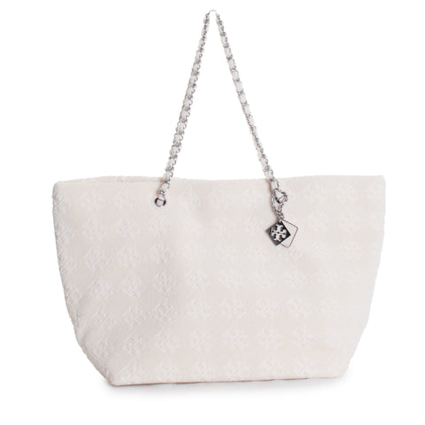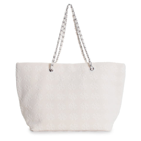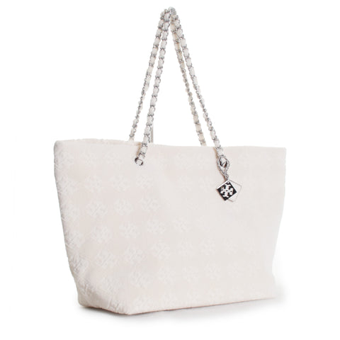 Keep it fun and flirty these warm summer months with the Ella Chain Terry Tote by Tory Burch. Featuring the classic large logo detail, this handbag was crafted for the girl who likes to keep her fashion sense fun.