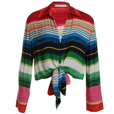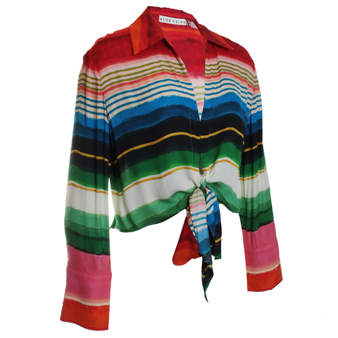 Bring some silky elegance into the fashion fold of your life with the Hannon Tie-Front Top by the timeless Alice + Olivia. Combine this bold blouse with a pair of pumps and a plain pair of denim jeans for a cool, feminine, and chic look.